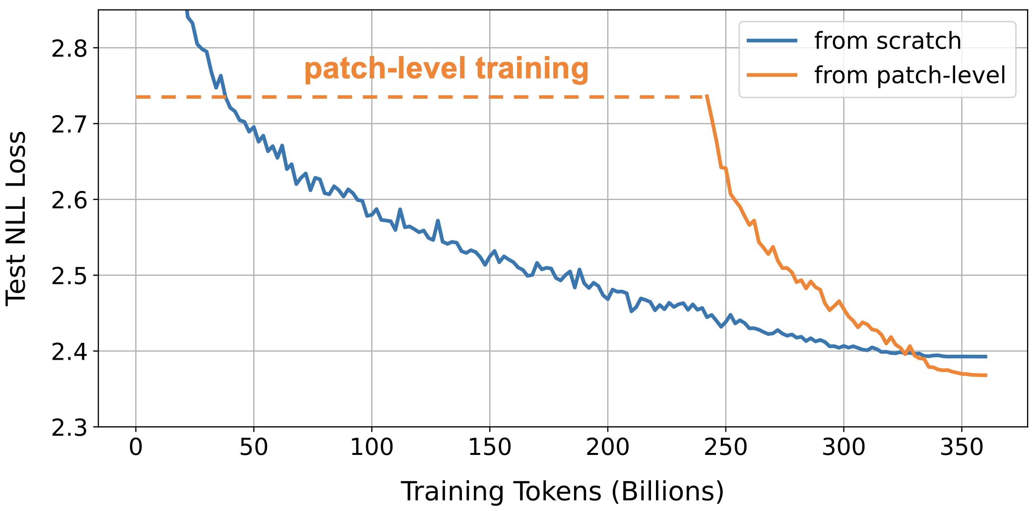 In our previous work on patch-level training, we attempted to sidestep this issue by grouping tokens into larger “patches” and training the model to predict the next patch. This allows us to process the majority of the training data at a significantly reduced cost. While this approach successfully cuts training costs by 50% without sacrificing performance, it is still constrained by the discrete nature of text. We ultimately have to fine-tune the model back to the token-level, and inference remains a token-by-token process.
